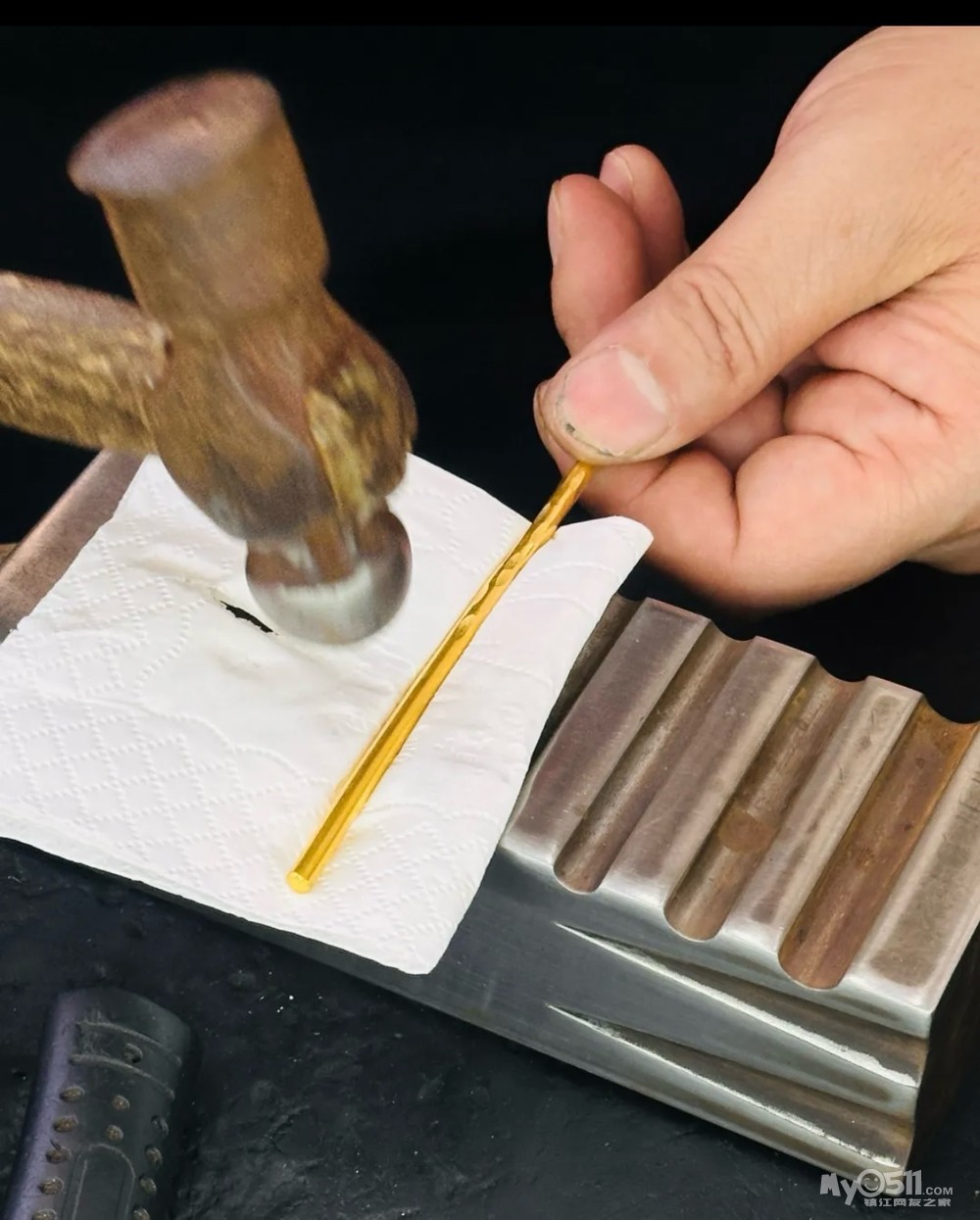 家里的旧首饰、银行的金条,都行。带过来,熔了,打成新的样式。只付加工费,克重不变。素圈、古法、泥鳅背这些经典款,工费一克十来块钱。全程可以盯着做,零损耗。打完了往手上一戴,跟品牌店买的一样亮。