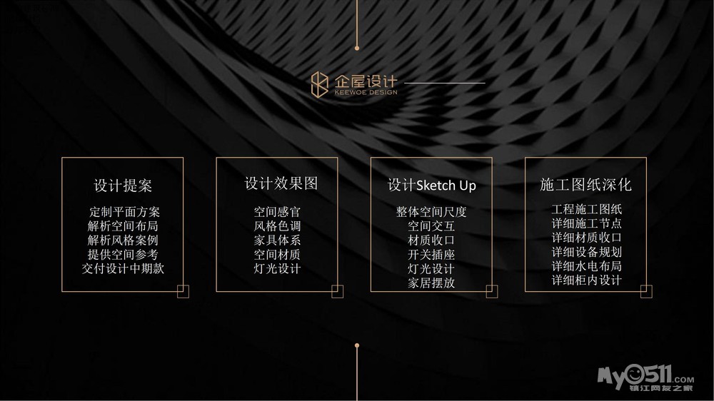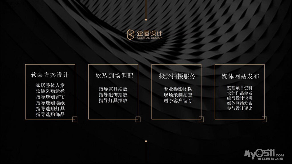 企屋设计是一家集定制设计、精工装饰、品质软装于一体的专业设计公司。 如今企屋设计要做的不仅是打破传统,更是为每一位尊贵的客户 提供量身定制的个性化服务,让每一位客户拥有其别具匠心、施工精 湛的艺术品。 企屋设计进入镇江以来,服务超过200位住宅及商业客户,我们 以优质的专业素养、一流的设计品质树立了良好的品牌形象,赢得了 社会各界广泛的认可,作品多次被行业杂志约稿,刊登在国内多家专 业室内设计网站。 企屋设计始终致力于为客户提供更丰富的专业空间设计,经过多 年的专业积累,我们整合了更多的资源,带着更好的精神面貌革故鼎新,为您带来更为尊贵奢华的生活体验,和您共同完成一场展示生活 品味的交流。