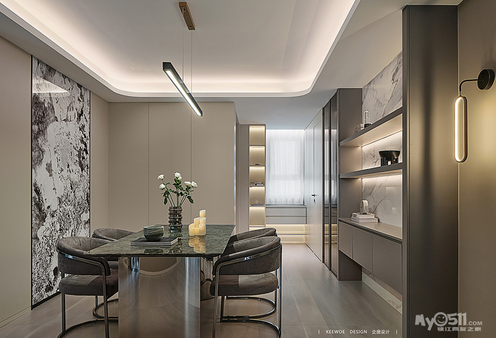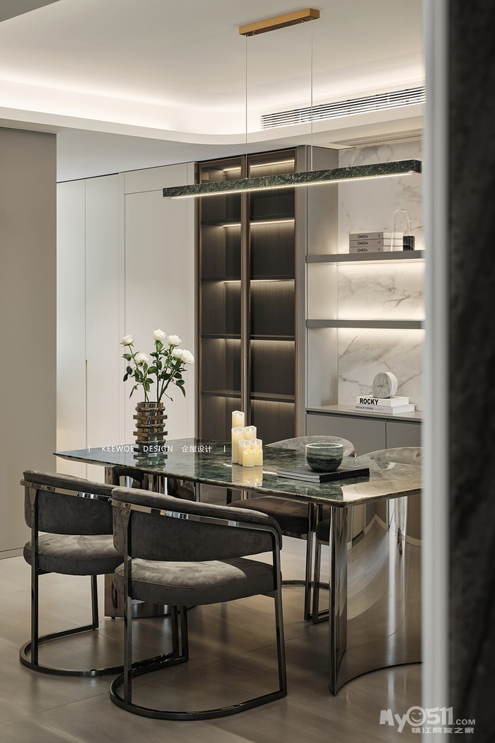 开放的用餐空间让一家人的联系更紧密,不同材质组合简单明了,将人的注意力集中在空间的感受上。