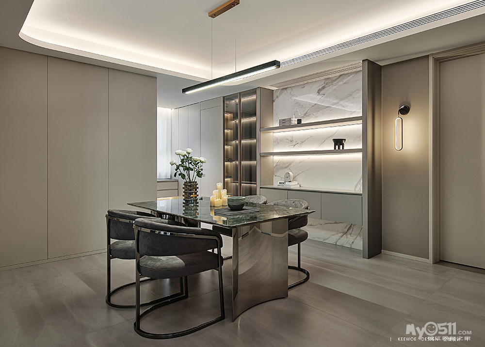 简约的大理石材质结合镜子的视觉延伸,营造空间的通透感。简洁理性的线条语汇作为主体构架。