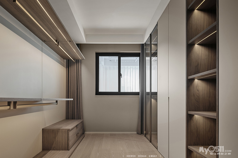 同色系板材,将密闭的空间得以延伸,所有衣物明朗呈现,存取便捷随心,让空间看得见的规整有序。