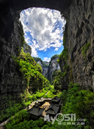 天龙桥、青龙桥、黑龙桥气势磅礴的横架于天坑之上,站立其下,在自然力量面前更凸显人类的渺小。罕见的奇观也让这里成为多部中外电影的取景地,变形金刚4中擎天柱在此地驷服钢索的场景也成为系列电影中最精彩的一幕。