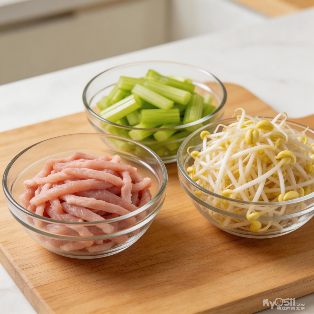 1、芹菜洗净,切成5厘米左右的段;黄豆芽洗净备用。猪肉丝加入料酒和淀粉抓匀, 静置10分。
