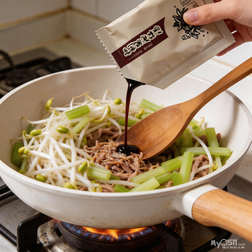3、炒锅加入适量油,放入肉末煸炒,炒至肉变色加入幸运酱油,随后加入葱末、姜末继续翻炒。下人芹菜和豆芽大火快炒,添上小半碗清水煮沸。