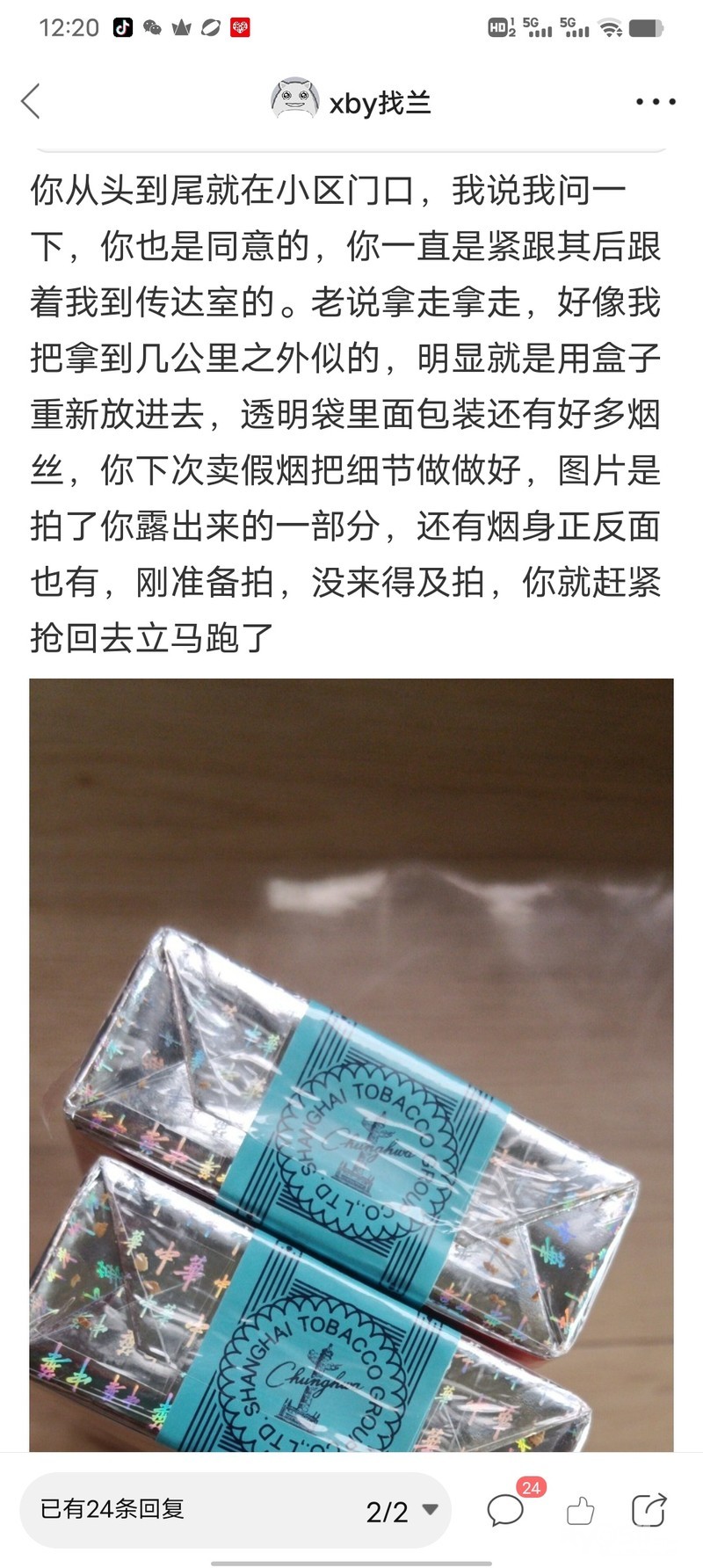 这个朋友我为你点赞,你说烟丝会出来这个很正常,不能说烟有问题,这个烟一直放在车里,晃来晃去,烟丝肯定会出来的,楼主说我是做假烟的,假烟真有这么好做吗?你做一个看看,还说盒子是真的,里面烟是重新装的还添加了什么违禁品,我胆子确实够大,为了这个几十元,敢以身试法,再说要有这个水平,我早就发财了,犯不着为了二包烟,几十元给你送过去,再说做犯法的事迟早会进去了的,我觉得没有必要,家里上有老下有小,真不想活了吗,我卖烟加起来最少卖了15条了,没有一个说是假烟,好像那些买烟的都是傻子,一辈子都抽的都是假烟,所以分不清楚烟的真假,你说要拿去看一下,我还以为,就在旁边,你直接跑小区门卫室里,我后来才过去,因为要关门锁车,但是我没有进去门卫室,里面情况不了解,后来我匆匆忙忙就走了,因为你说了这烟是假烟,我还有什么好说的,还不走吗?还和你去争辩吗?还说什么不敢过去门卫室,我有不知道你在门卫室里,再说我知道哪个是你呀!小区门口人来人往,只有按喇叭来提醒一下,后来只有打电话才看到你接电话,才能确认是要烟的是你。我就搞不懂我怎么就买假烟了,别人付款买烟的付款码,你说假的也可以,人在做天在看头顶三尺有神灵,一切都是最好的安排,愿你买到你真品的香烟。阿弥陀佛!!!