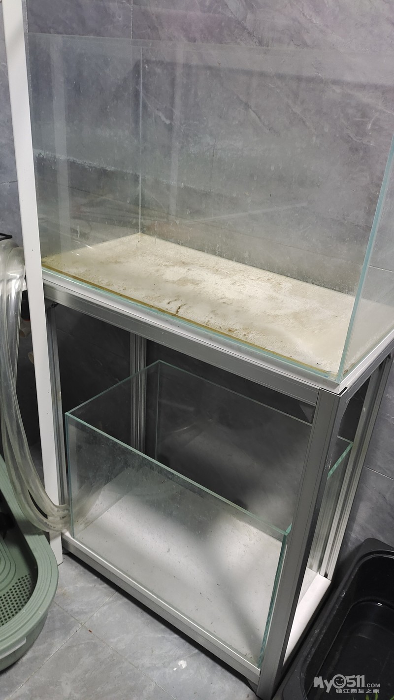 两组鱼缸,铝合金架子长宽高60*30*70,上层鱼缸尺寸60*30*36,下层鱼缸50*30*35,两个架子,四个鱼缸,每组150元