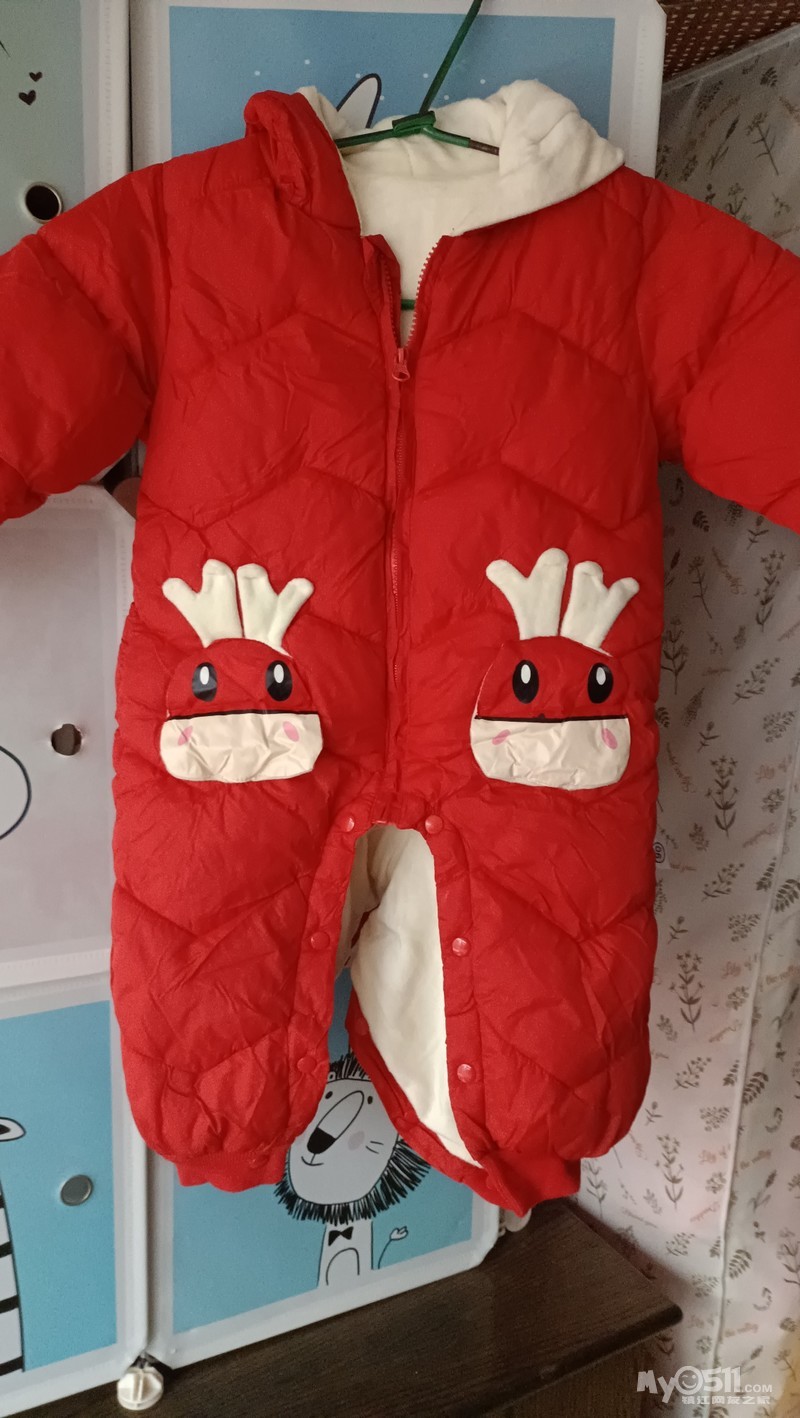 几乎全新的宝宝连体棉服,红色小鹿造型,90码适合冬季穿,加厚棉填充,保暖又舒适,帽子带耳朵特好看,便宜出50元,电话微信同号13852907494