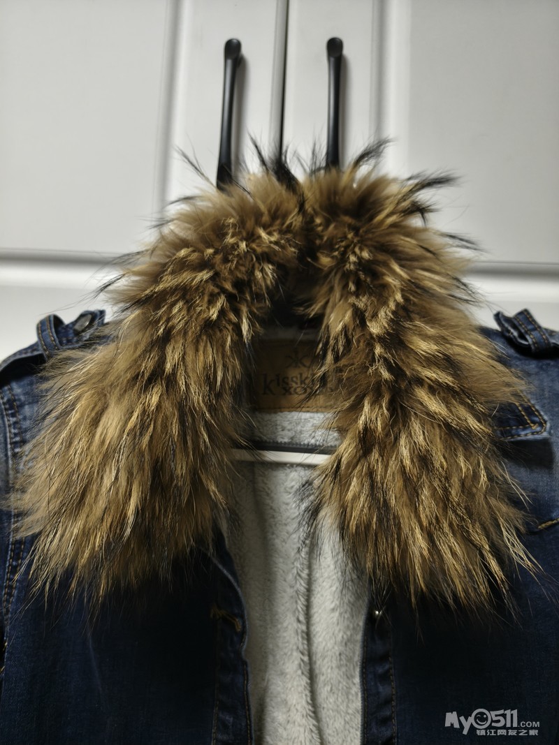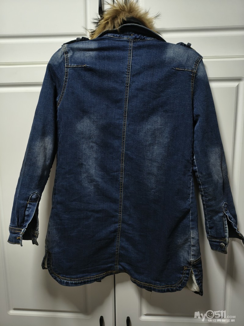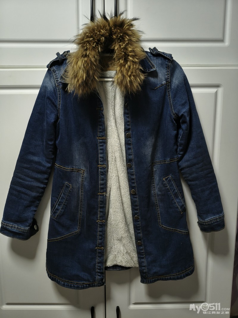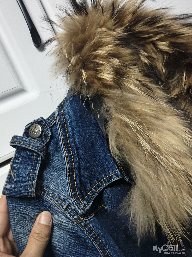 牛仔外套,貉子大毛领,可拆卸,秋冬款,中长款,内里加绒,穿着很暖和。全新,纽扣洞都没开,l码,50出
