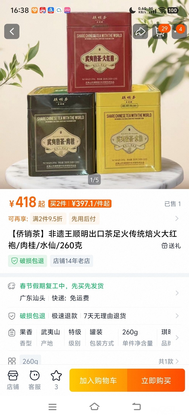 过年礼盒处理 每件300(每罐) 乌龙茶武夷山肉桂和水仙 最后一个礼盒是正山小种特级红茶 去年年底买的 日期都有 保质期三年至五年 需要的联系