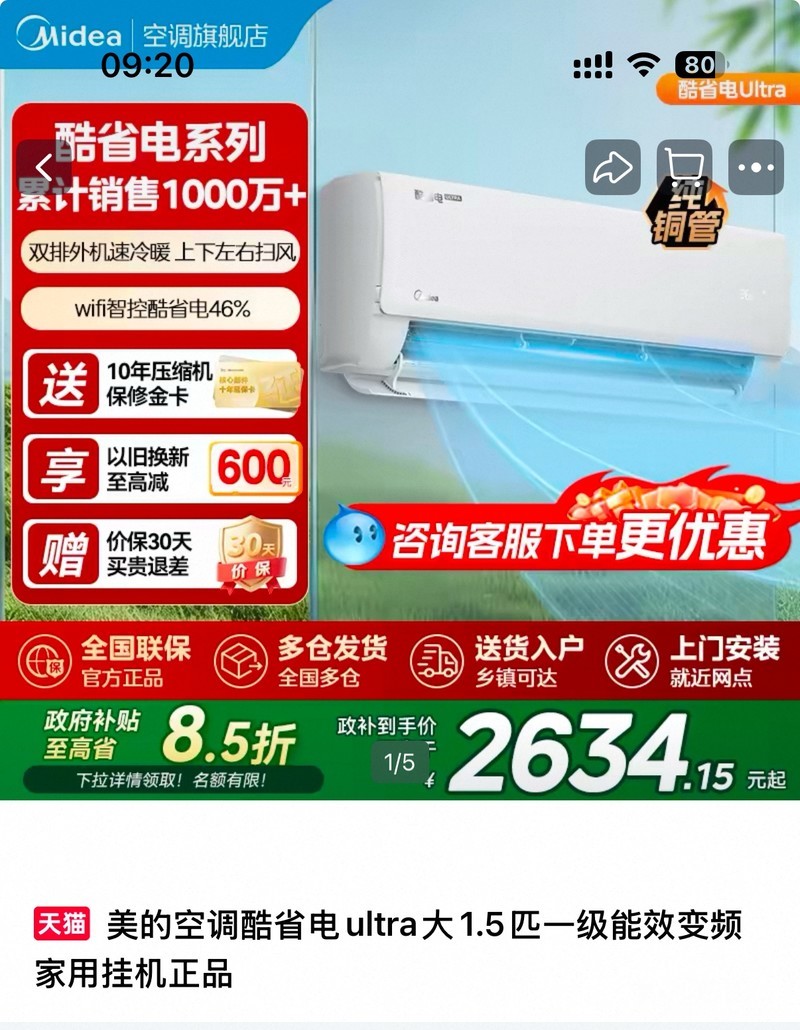 出美的空调酷省电ultra 大1.5匹一级能效变频