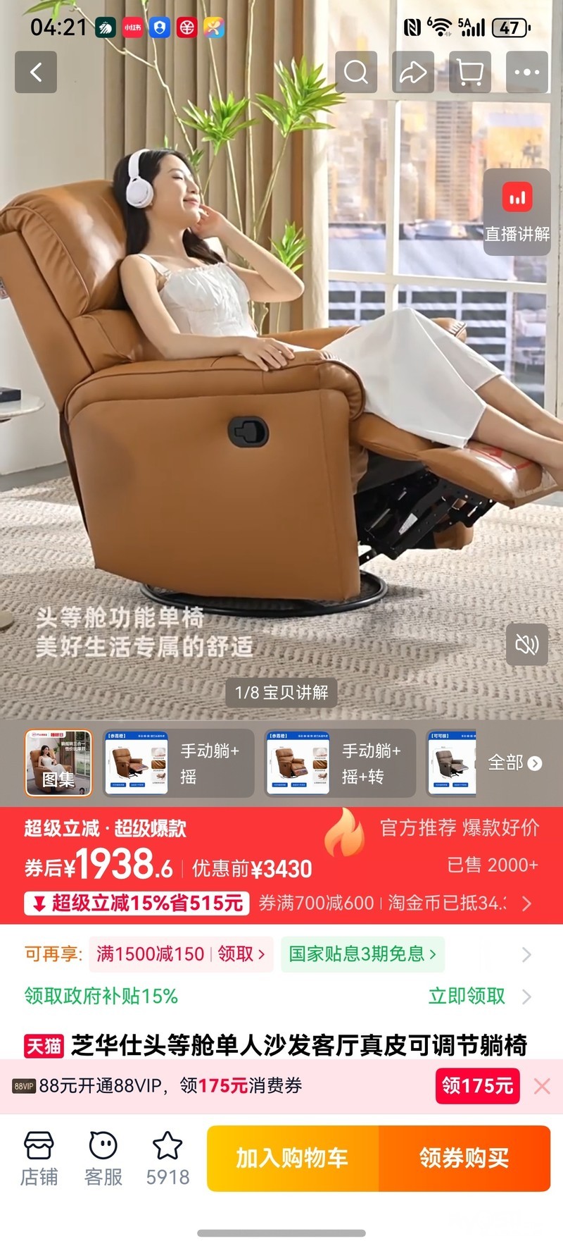 芝华士单人摇椅沙发嫌大,原价1900左右,现在1380转(红星美凯龙实体店购买) [广告推广]