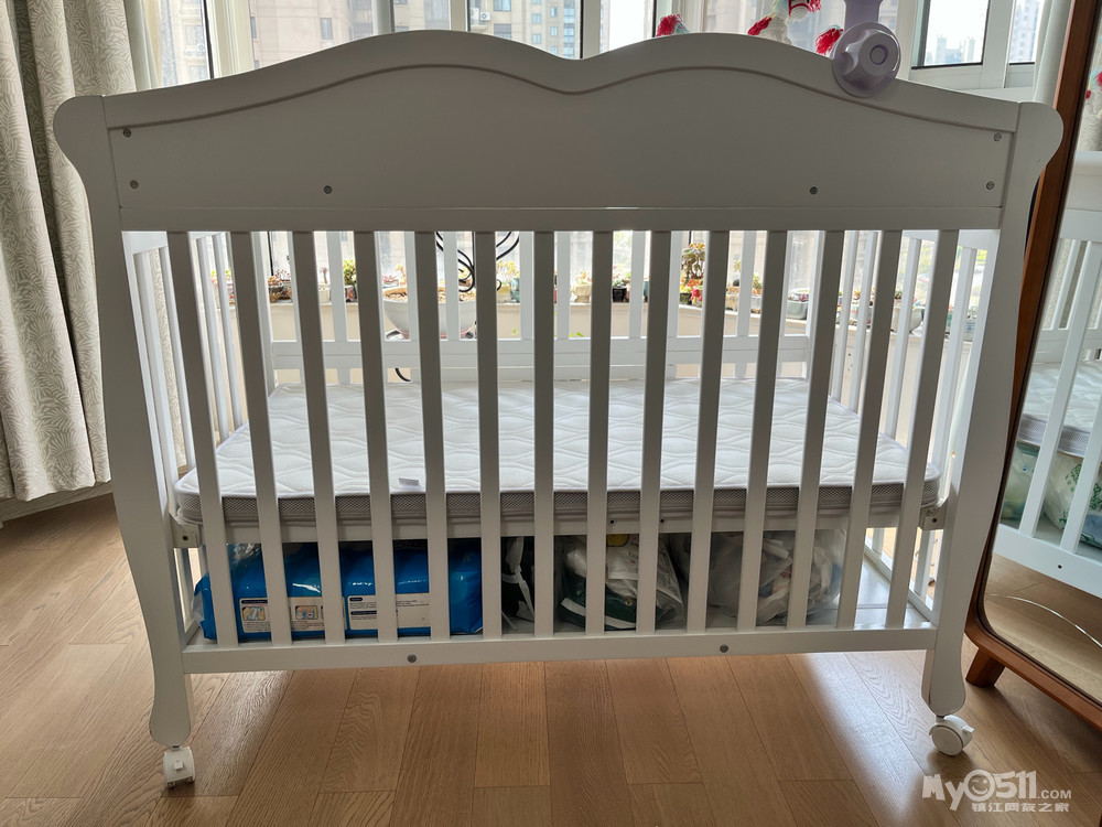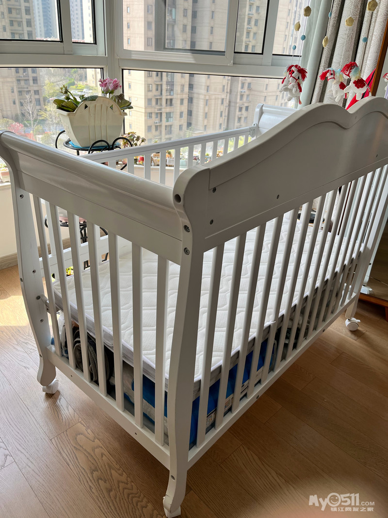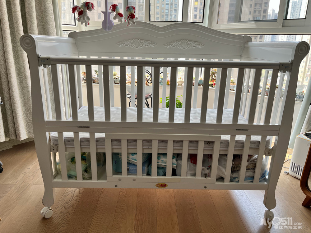 品牌实木婴儿床95成新,长130厘米,宽69厘米,前高89厘米、后高111厘米,带床垫可调节高度带滚轮可移动,质量超好带超大储物功能,可拼接大床附实拍图,原价一千六百多现350元自提,联系电话18852800577微信同号