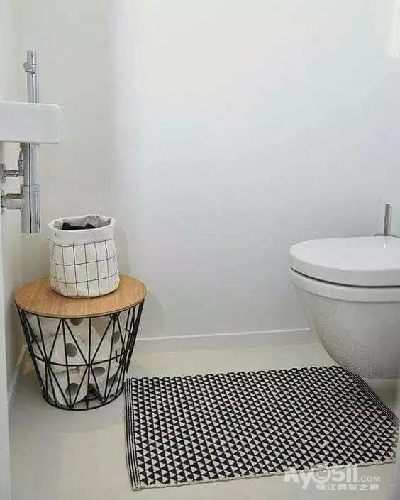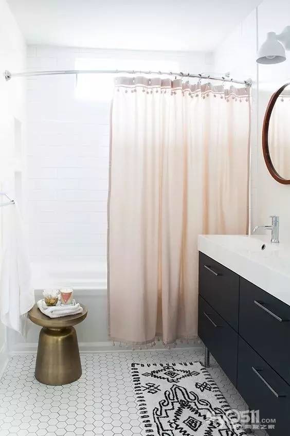 除了浴帘以外,小小的浴室地毯也是不错的选择。