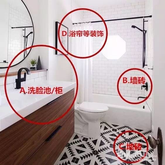 根据上面的案例图,我们来分析一下,在浴室布局都差不多的情况下,怎样可以让自己家的卫生间在芸芸卫生间中脱颖而出。(不按标记顺序)