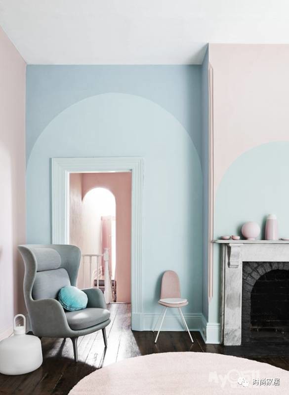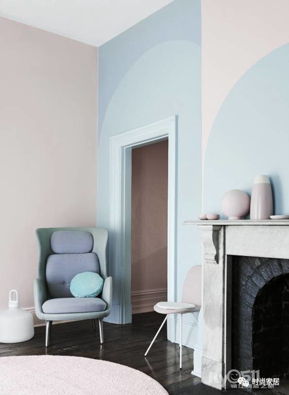▲粉蓝是分别属于男孩、女孩的颜色,撞在一起感觉整个房间嫩出水,绘制的形状又和家中拱门、壁炉、椅子的元素相互呼应,显得十分柔和。