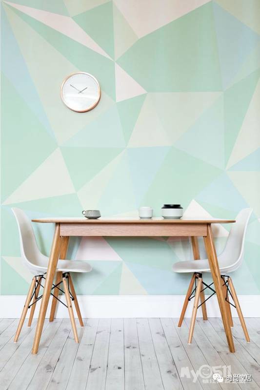 ▲同色系深浅色块的拼接,打造绝无仅有的裸眼3D立体感,搭配同样几何形状的镂空椅子打造了一个前卫、活力的空间。
