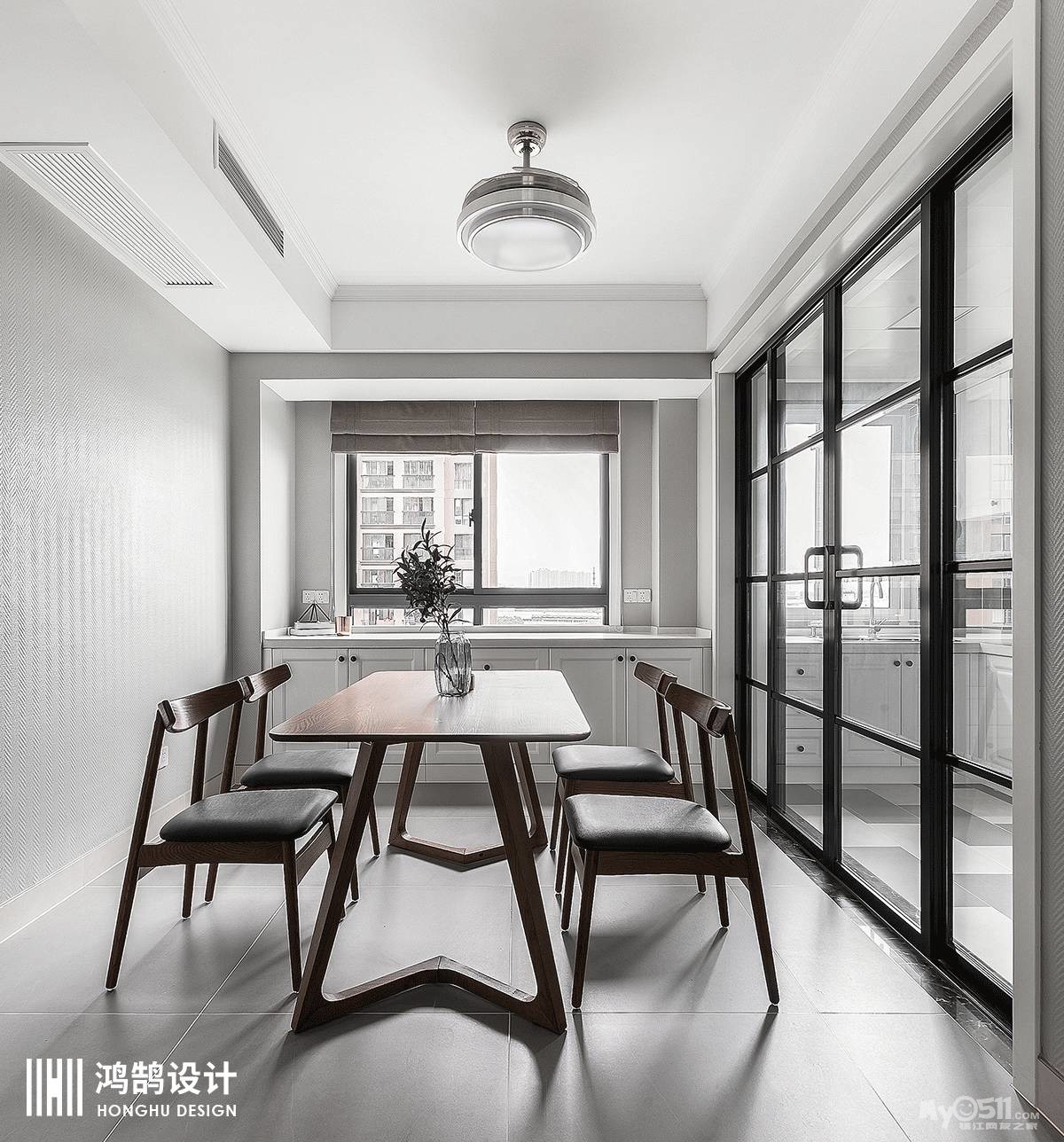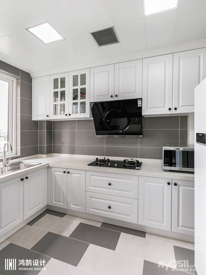 巧用黑框玻璃移门将厨房与餐厅隔开,构建了一个完美的中厨空间,白色定制橱柜尽享干净与整洁。