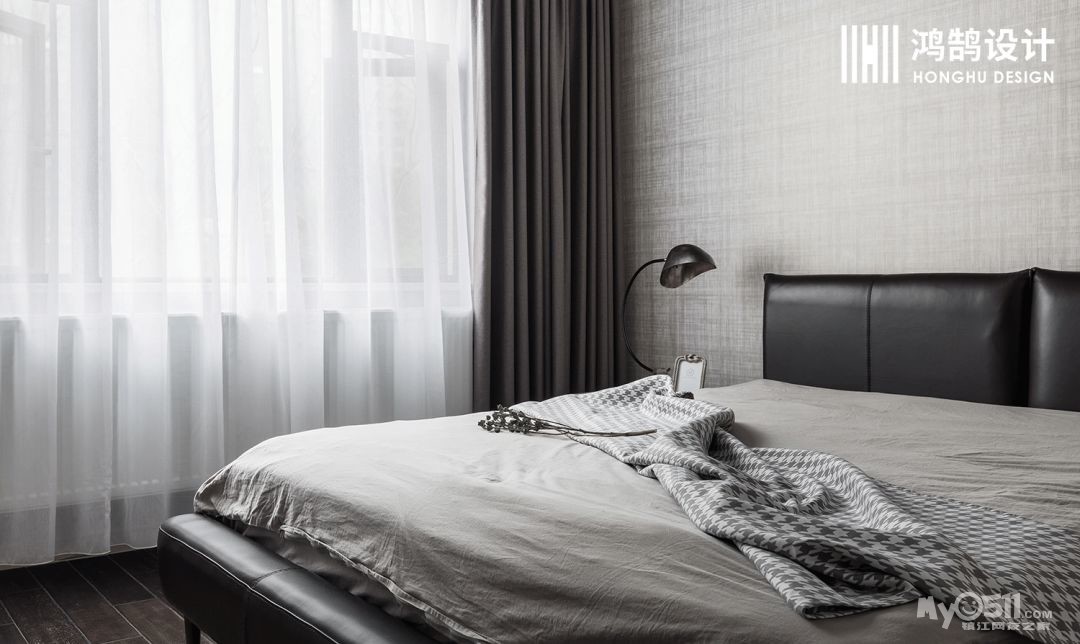 对比:用皮质床代替木质床,用冷色调墙代替暖色调,让空间和氛围瞬间降温。