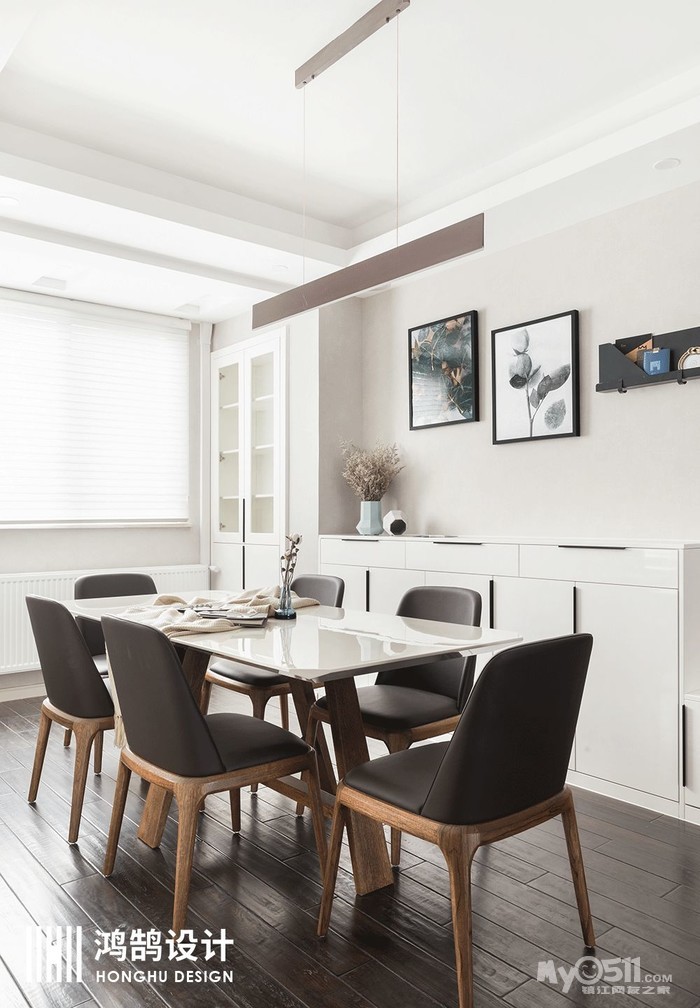 餐厅的整体布局,贯穿客厅,以白色氛围为主,加上深咖色桌椅进行调剂,让就餐氛围既轻松,又有仪式感。