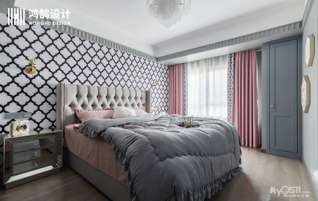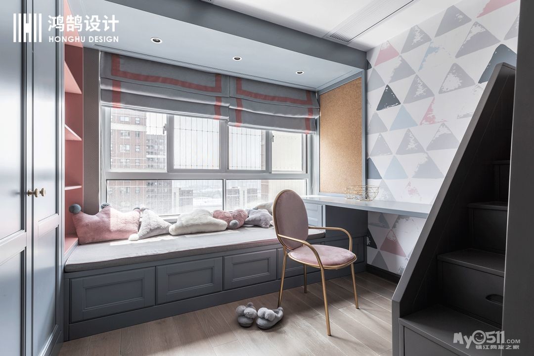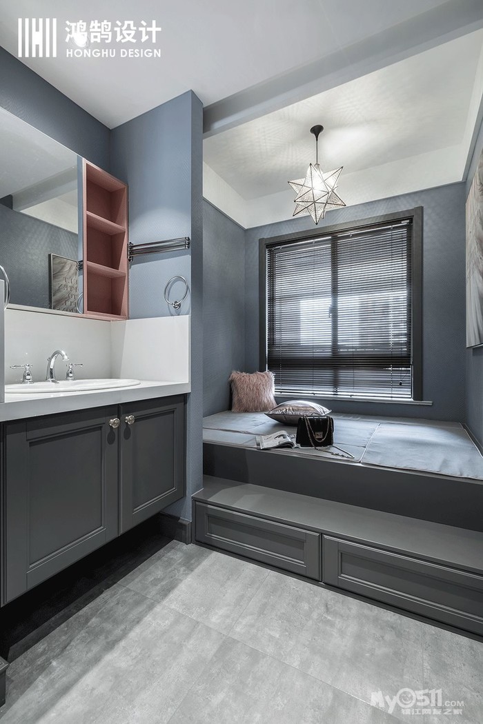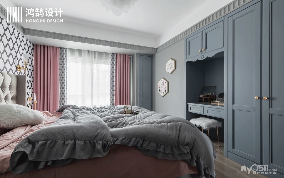 大胆的布置不止步于卧室,卧室依然选用了粉色和高级灰的搭配,使得本来炫目的形状背景墙变得柔和,温暖,在橱柜的设计上,更是用了一种饱和度较低的蓝色,瞬间将整个空间降温,冷却,让心沉静下来。