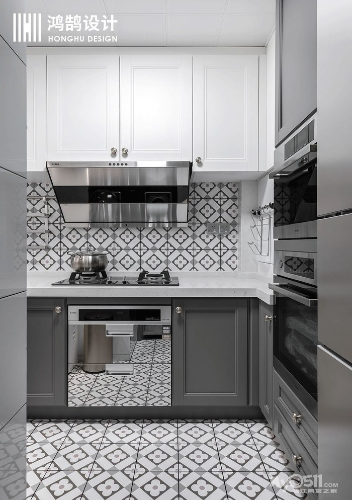你以为的厨房应该是规规矩矩,横平竖直,但是在整体氛围的衬托下,本案例的厨房延续整体风格,用花砖上墙的形式,让厨房空间显得既不局促又实用性强。