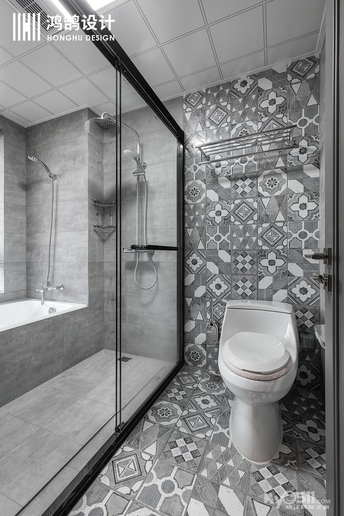 卫生间通过花砖上墙打破了整体空间的沉闷,让即使只有黑白灰的小空间里也变得格外精致有型起来。