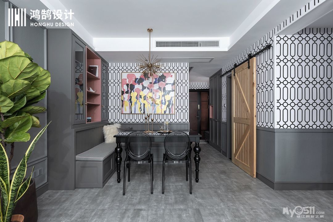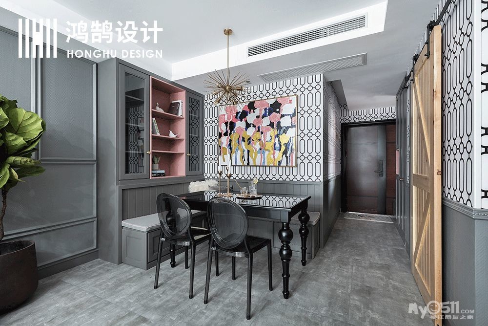 餐厅以灰黑色搭配,用卡座的形式,增加空间的利用率,同时很心机的用一个原木的移门作为厨房的门,既起到点缀的作用,又让整体空间看的开阔,大气!