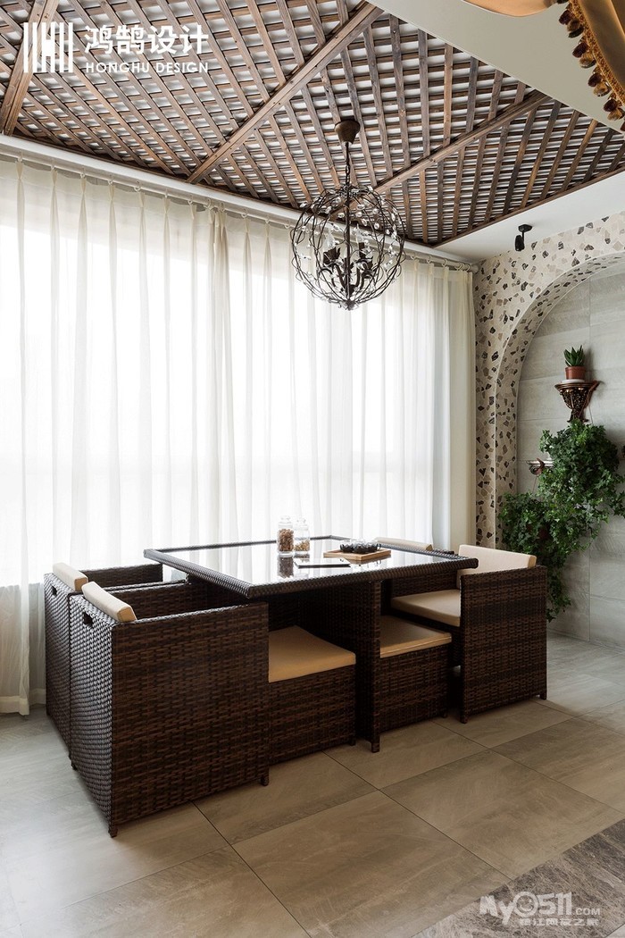 区别于传统阳台的设计,在本案例中,阳台的设计也是业主较为喜欢的部分,将阳台空间利用起来,设计成一个小小的休闲区,既能邀请客人到这个区域谈天说地,也同时具有晾晒功能。