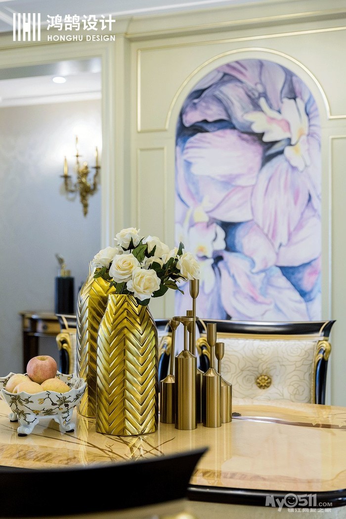 餐厅的背景墙,没有用壁画,而是业主精心选择了一名画师,画了一幅精美的作品,相对于挂画,更有灵性,且更具艺术气息,让整个就餐氛围仿佛充满了芬芳。