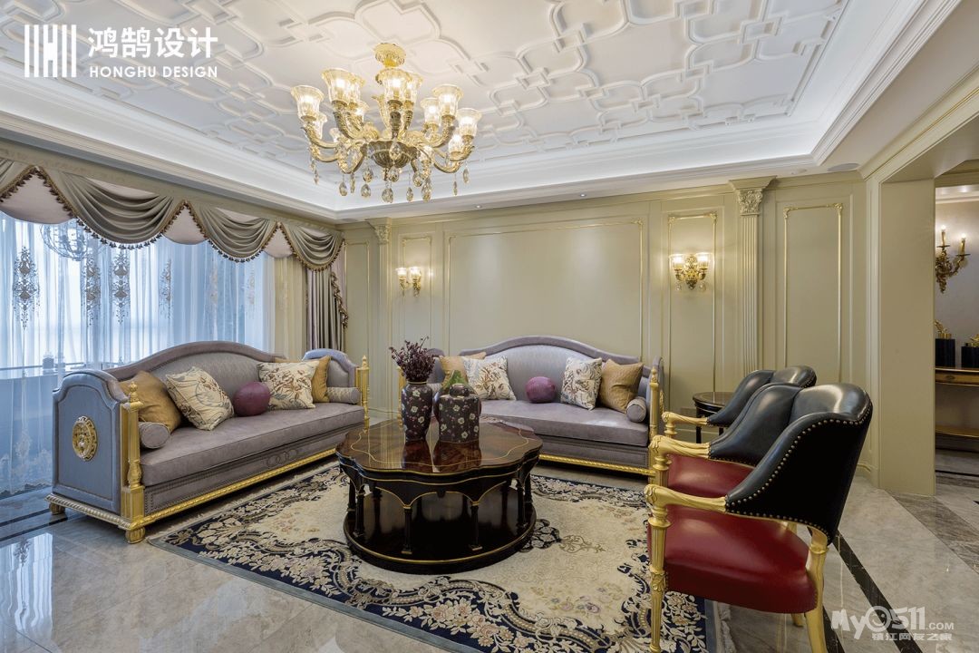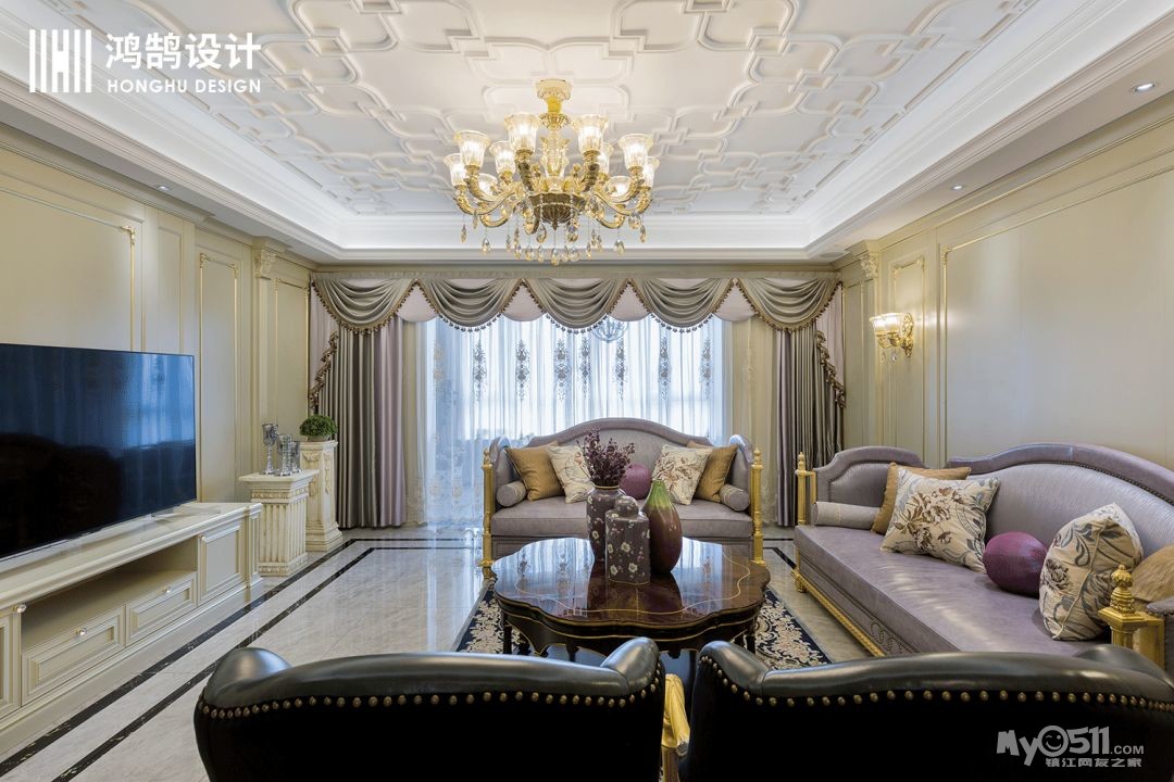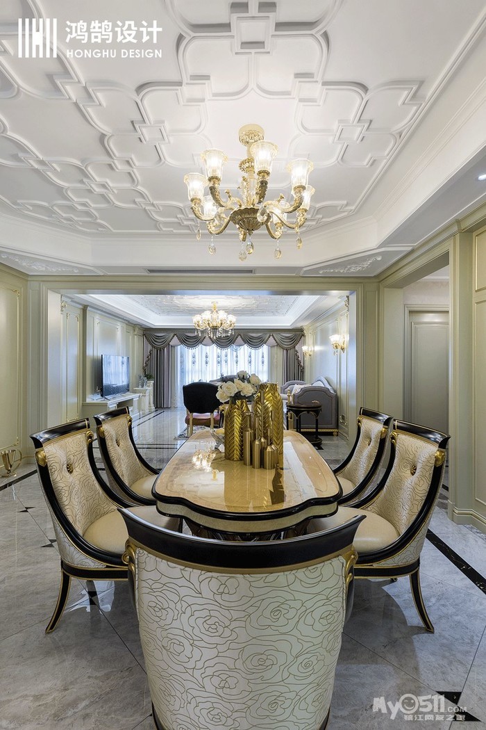 私人定制的雕刻吊顶搭配法式水晶吊灯,华灯初上,仿佛进入一座古老的城堡,参加一场盛大的舞会。