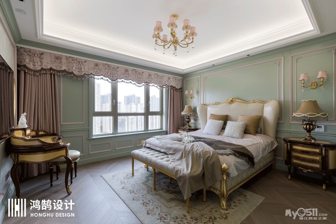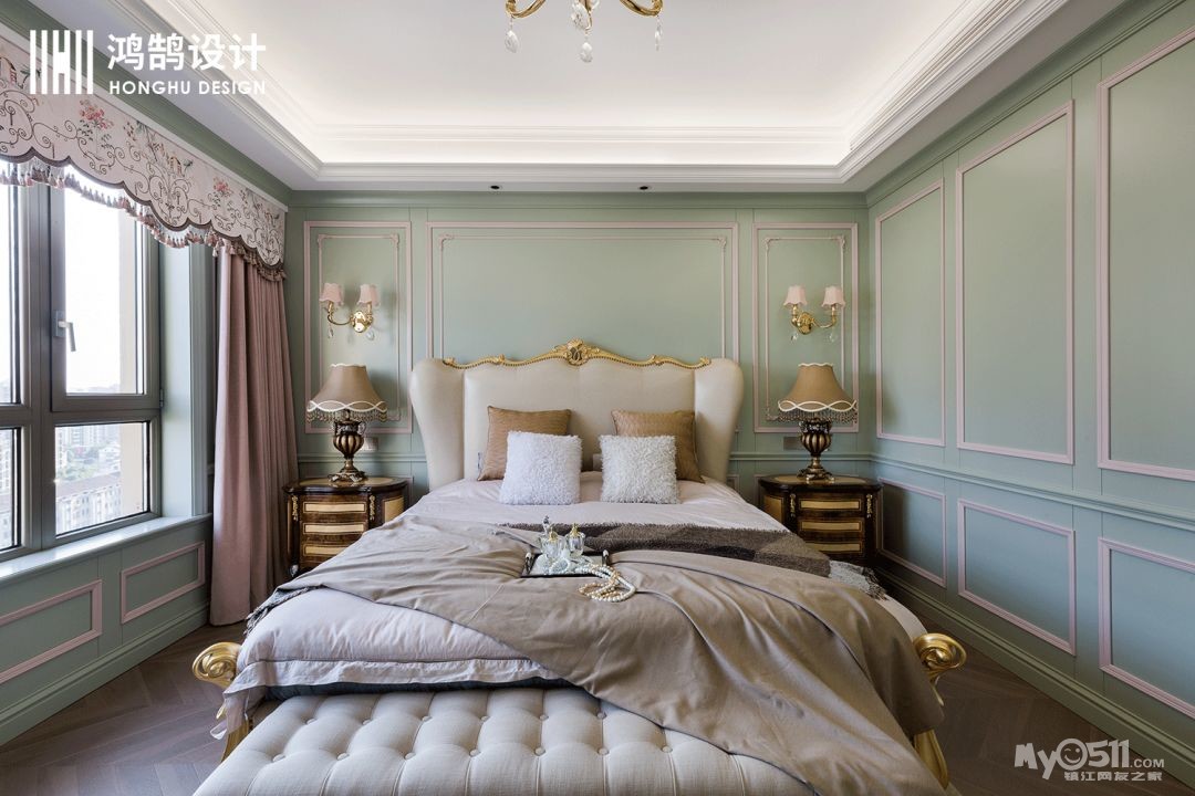 大概所以女性都有一颗粉色公主梦吧,在设计之初,女业主是希望自己的主卧能以粉色为主,但是设计师考虑到长时间对着粉色会有审美疲劳,所以沟通下来,设计师将粉色镶嵌在薄荷绿的护墙板上,颜色既能互补,也保持了一个小清新的空间风格。
