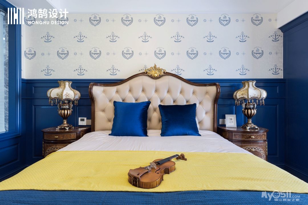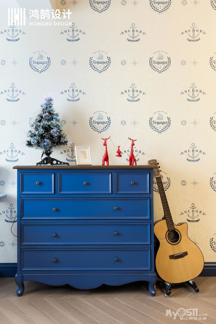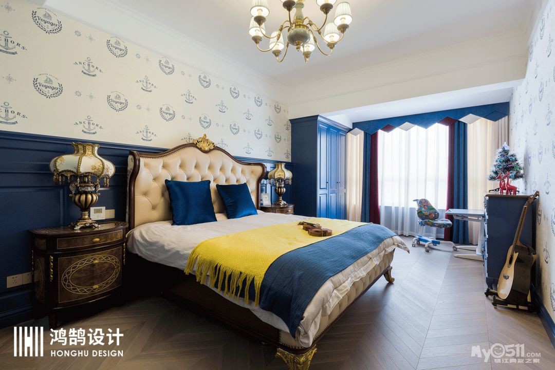 儿童房选择了复古蓝作为主色调,既保留了法式的风格,也体现了小男孩的空间和童趣。