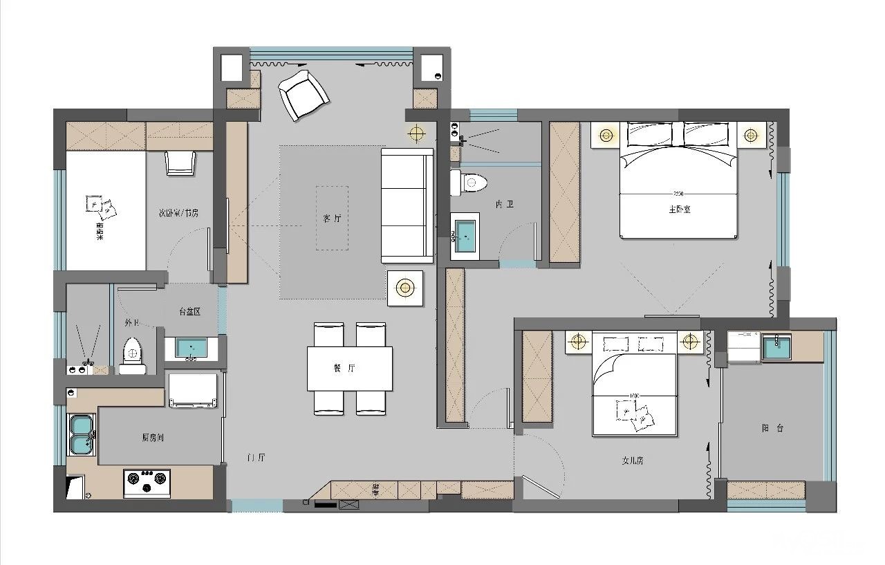 客厅东面的窄阳台我们直接把他归纳到了客厅的公共区域,不做其他用途,增加了客厅的采光以及空间。