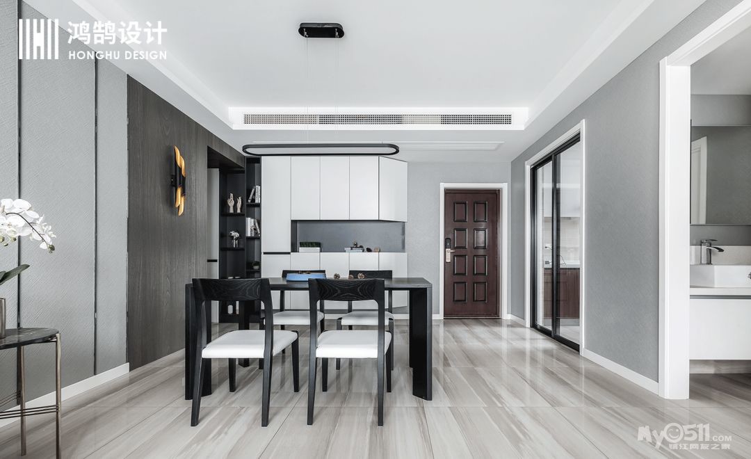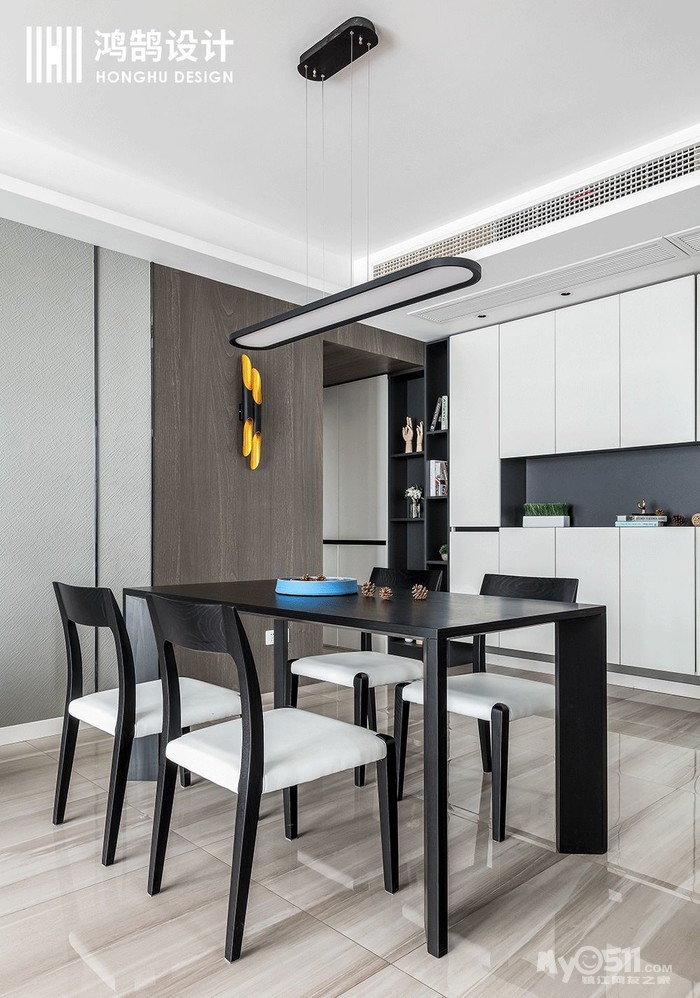 餐厅空间,一改灰色调子,主要选用了黑白的木质材料,无论是颜色上还是材质上都与整个空间融为一体,既能区分客餐厅,也能让整个餐厅变得干净有秩序。