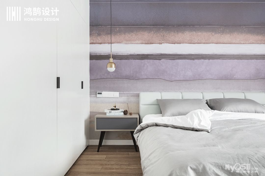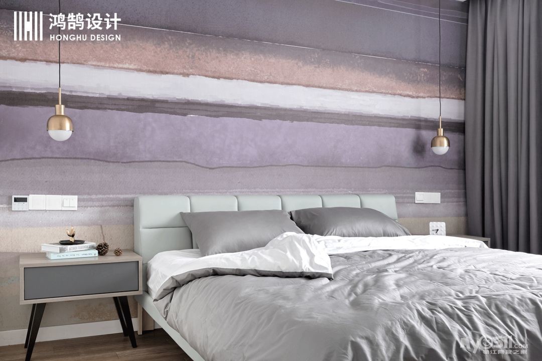 主卧的空间,相对客餐厅颜色上相对柔和很多,用富有设计感的墙纸作为背景墙,搭配上皮质的薄荷绿,给人一种佳期如梦的感觉。