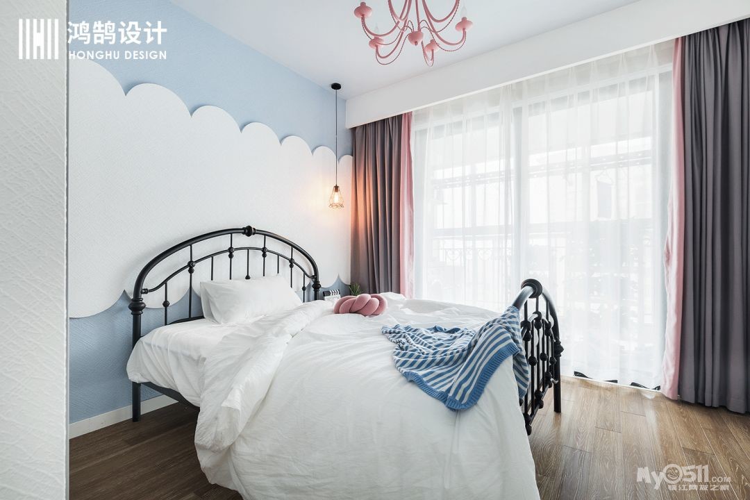 儿童房的颜色是整个空间中最丰富的区域,用蓝白色勾勒云朵的背景墙,用花苞的创意灯作为床头主灯,既好看又实用,少女心十足。