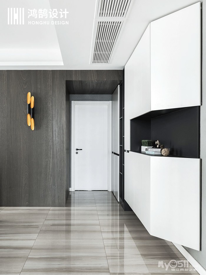玄关的整体设计并没有太多的花俏,而是考虑到实用为主,用一个富有设计感的定制墙柜,在安装时,并没有做到完全落地,给空间一定的留白,让整个柜体看上去并不会那么拥挤,反而很好地去装饰了空间。