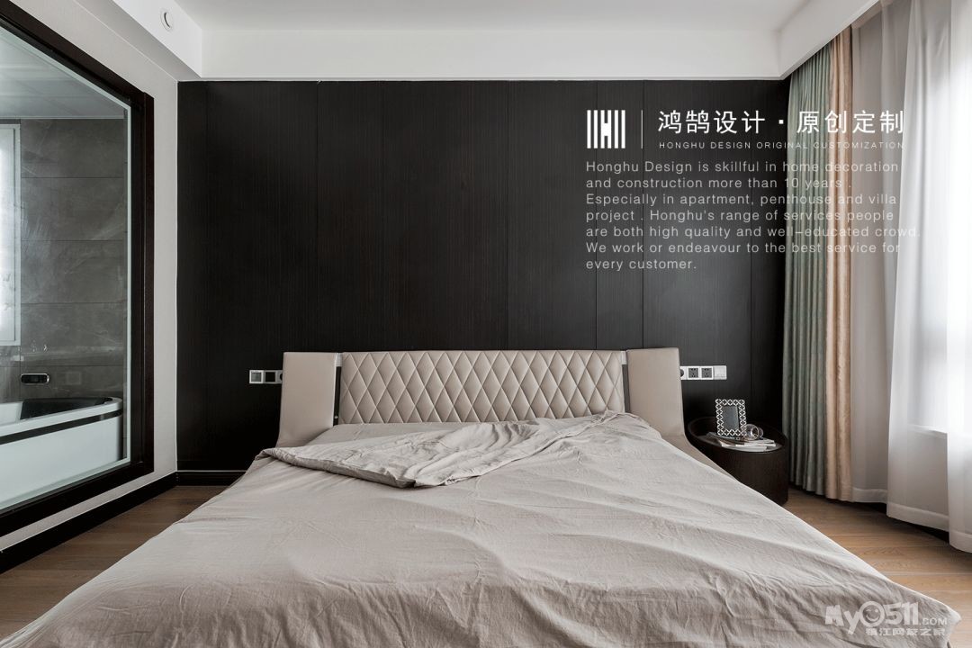 主卧无主灯设计,而是将灯光收纳于吊顶内,使室内显得更为柔和安适。设计将真正的尊享藏于每个细节,精细打磨的墙面与木制地板、细腻柔软的暖棕色床品,通过材质的光感隐透简净高雅的质感美学。