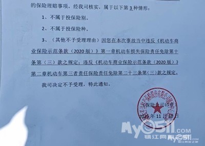 今天我展示一份来自中国太平洋财产保险股份有限公司镇江中心支公司的《不予受理通知书》。他们依据所谓的“2020版商业险条款”,通知我拒绝理赔。