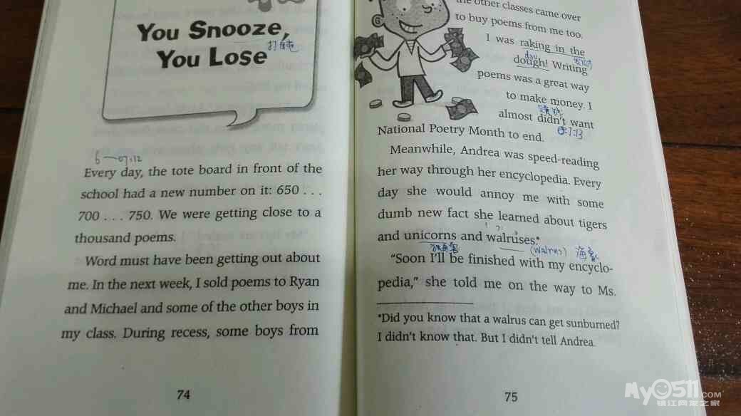 现在最后一套12本《我的疯狂学校Daze》,我给他注释的过程中已经没有几个生词了。最近国庆期间我上课比较忙,没有功夫给他注释,他也能够主动拿起英文章节书,独立阅读。