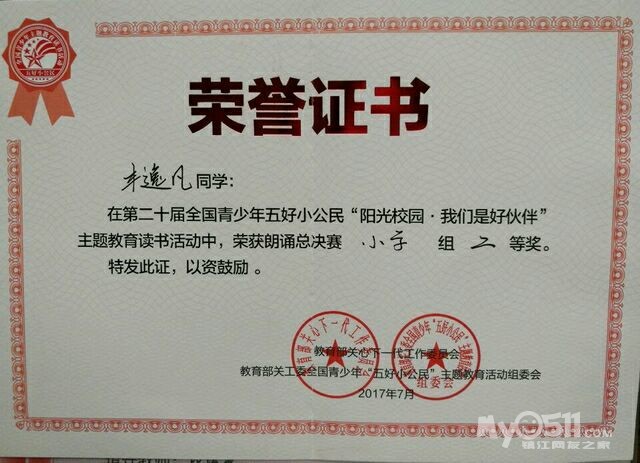 7月28日至30日,第二十届全国青少年五好小公民“阳光少年我们是好伙伴”主题教育读书活动朗诵、演讲总决赛在首都北京举行。宝塔路小学四(1)班丰逸凡同学参加了此次朗诵总决赛,并一举荣获小学组二等奖的佳绩。