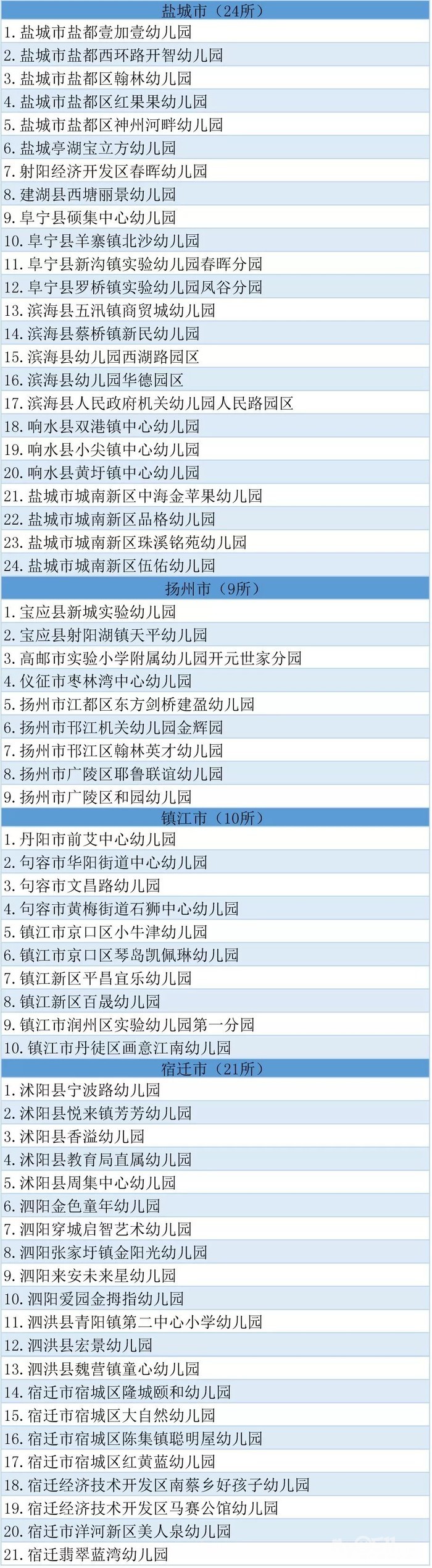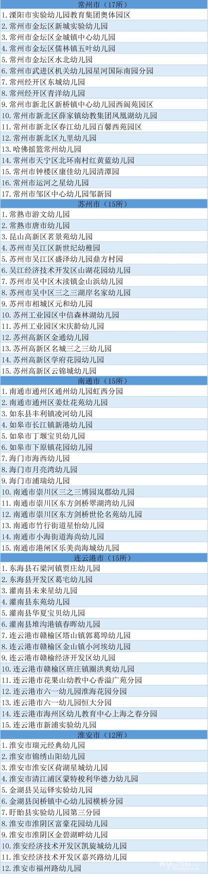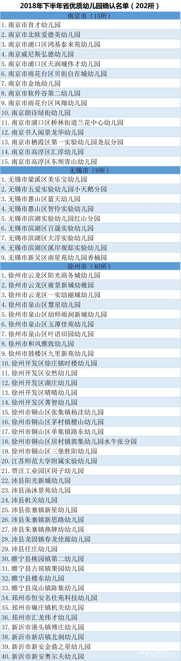 2018年下半年,全省共有254所幼儿园申报省优质幼儿园评估。经省教育评估院组织评估、省教育厅审核,确认南京市育才幼儿园等202所幼儿园为“江苏省优质幼儿园”(具体名单见下方图表)。