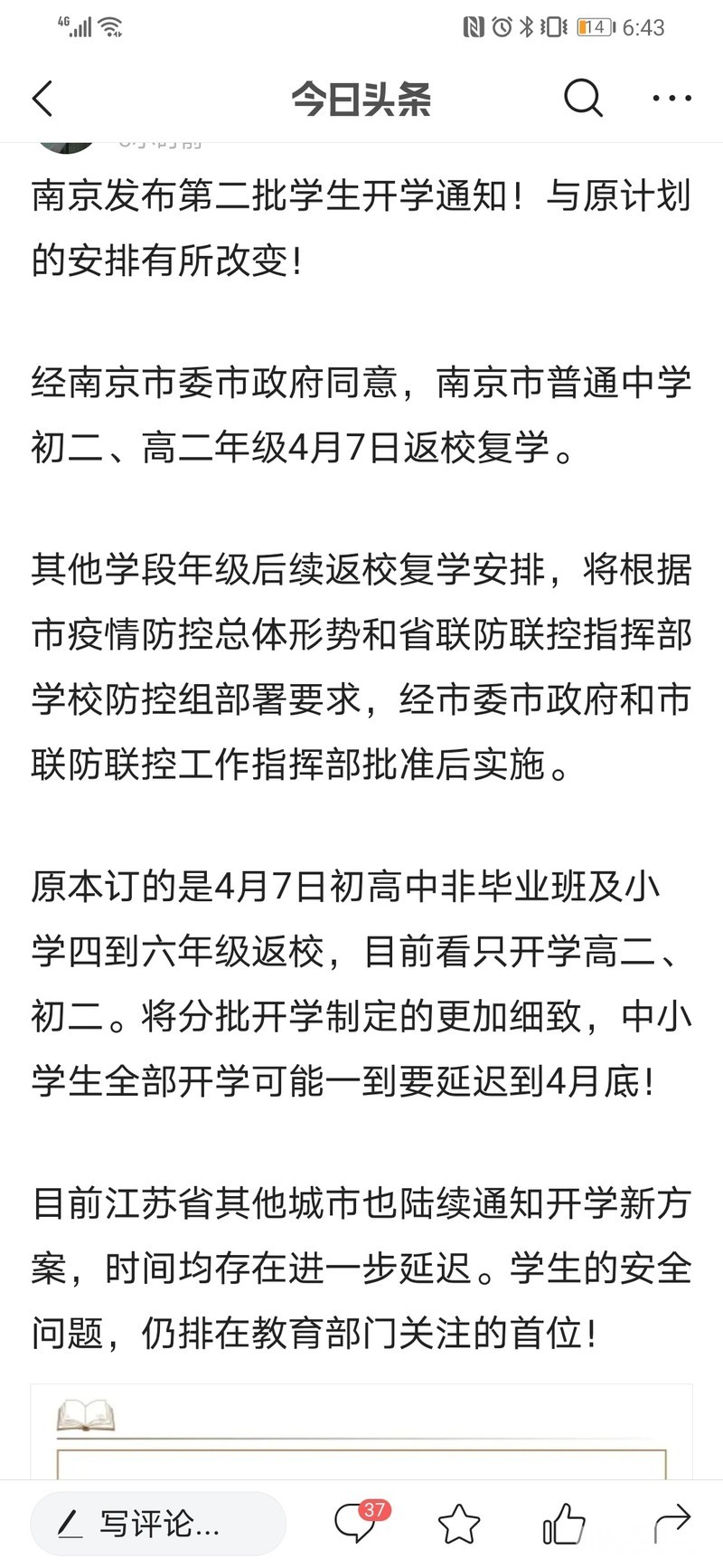 本来通知了7号上学,然后现在家长群里又说要推迟了,这是一会一个变啊~~只能坐等官宣了,不过教育局的文件只是说在什么时候开学,具体开学时间还是由各学校申报以后才能定。我心里还是有点担心的,当然我相信学校能开学肯定做好充足的准备。初中、高中没的说,像小学、幼儿园这种是不是可以再缓缓呢。你希望小学开学吗??