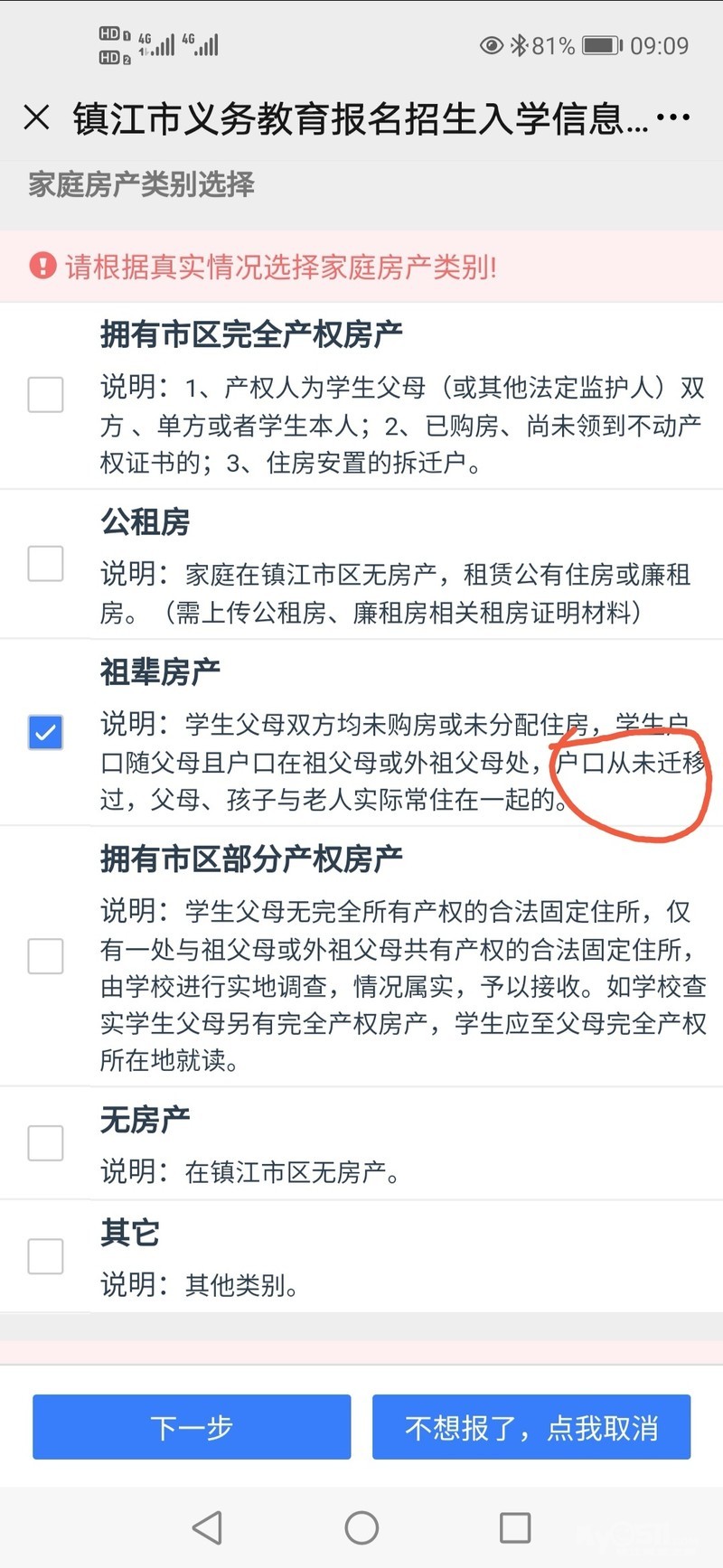 这个户口从未迁移到底是什么意思?小孩出生时不在现在的户口上,上幼儿园的时候才迁到现在的户口,户主和房产都是小孩的奶奶,现在小学报名这一项要求小孩户口从未迁移过,请问我家这种情况行不行,这项怎么选?(本地人,小孩父母名下无房产)