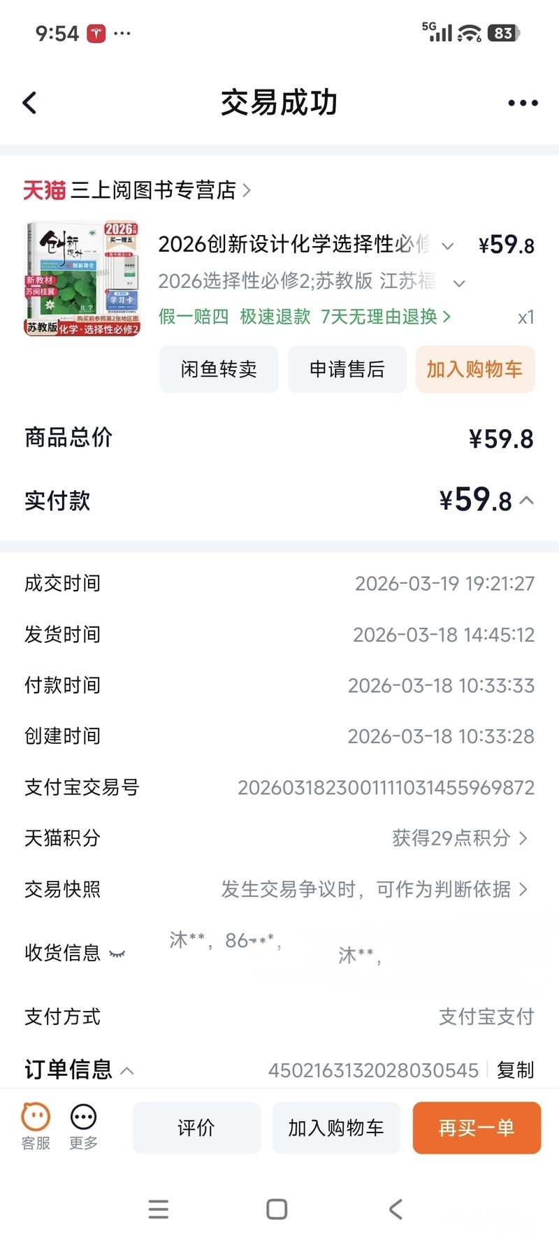 刚刚前两天才买的化学创新设计(选修二),2026苏教版,有淘宝购买记录。本来给娃课外辅导用的,现在不需要了,就写了1页,99.99新。30块转让,同城可当面交易。
