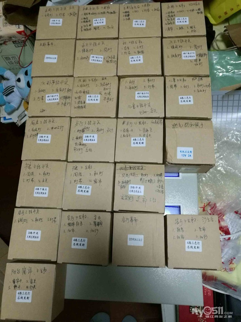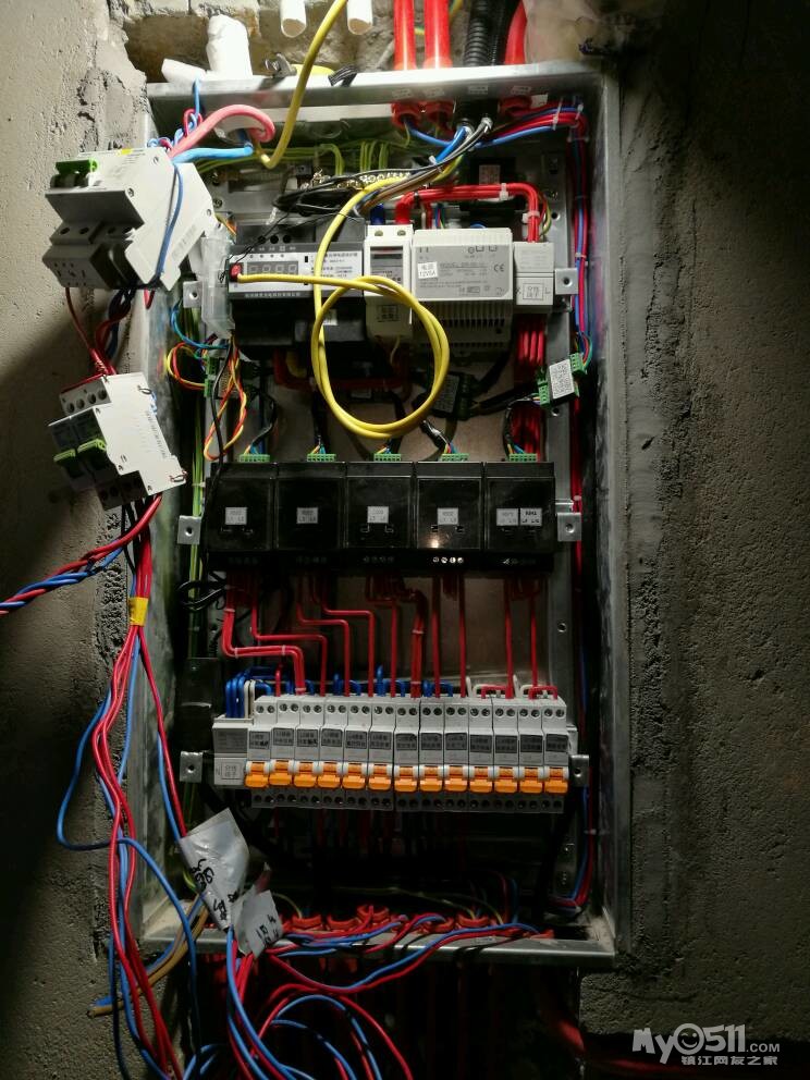 备注:5个黑色502智能继电器上方为485总线,总线通485智能主机,可有线或无线、手机远程控制12路插座开关的通断电;总漏电保护器左、上侧小盒子为智能门锁无线收发模块,接受和发射无线信号给门锁,通过智能主机进行联动(例:男主人开锁联动情景模式1、小主人开锁联动情景模式2、非法用户输入指纹密码联动监控和报警装置);12V5A轨道电源上方黑色小模块为智能电表协议转换模块,将智能电表的实时电压、电流、用电量、总功率发送至手机APP显示。