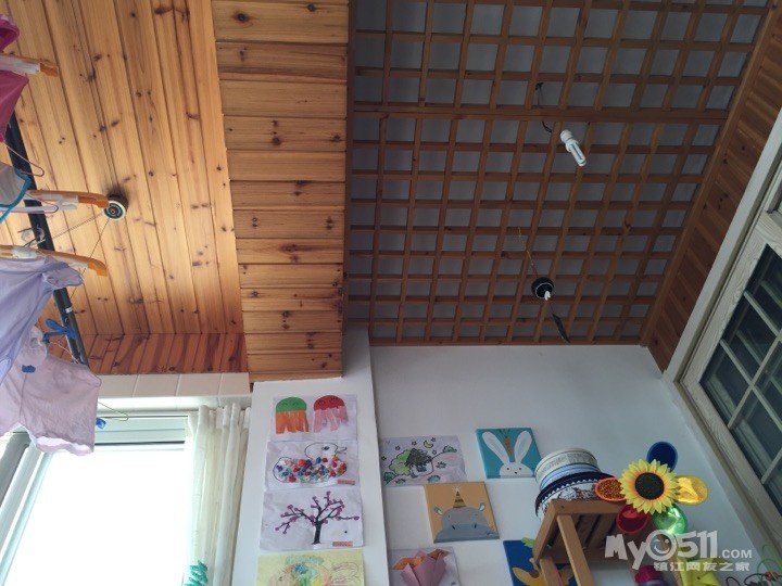 我家阳台的吊顶,阳台被人为扩大,原来的梁做了分界,一半杉木扣板,一半打得格子架子,功能区分为晾衣区和小朋友的活动区