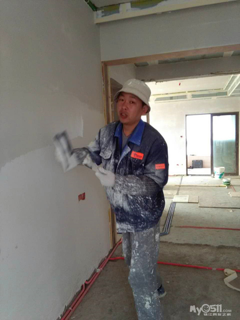 周师傅做事稳重,要言不繁,现场安排有序;许师傅细致、干练,注重效率。他们将墙面凹凸地方、天花板高低起伏所在,批刮处理得光滑平整;用多孔阳角胶条妥贴地安置于墙面阳角,让阳角垂直且加固;诸多细节一一顾及。