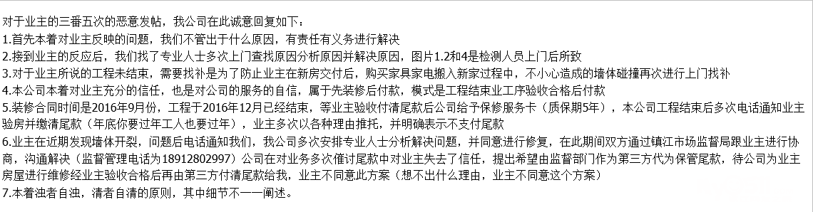 对于业主的三番五次的恶意发帖,我公司在此诚意回复如下: