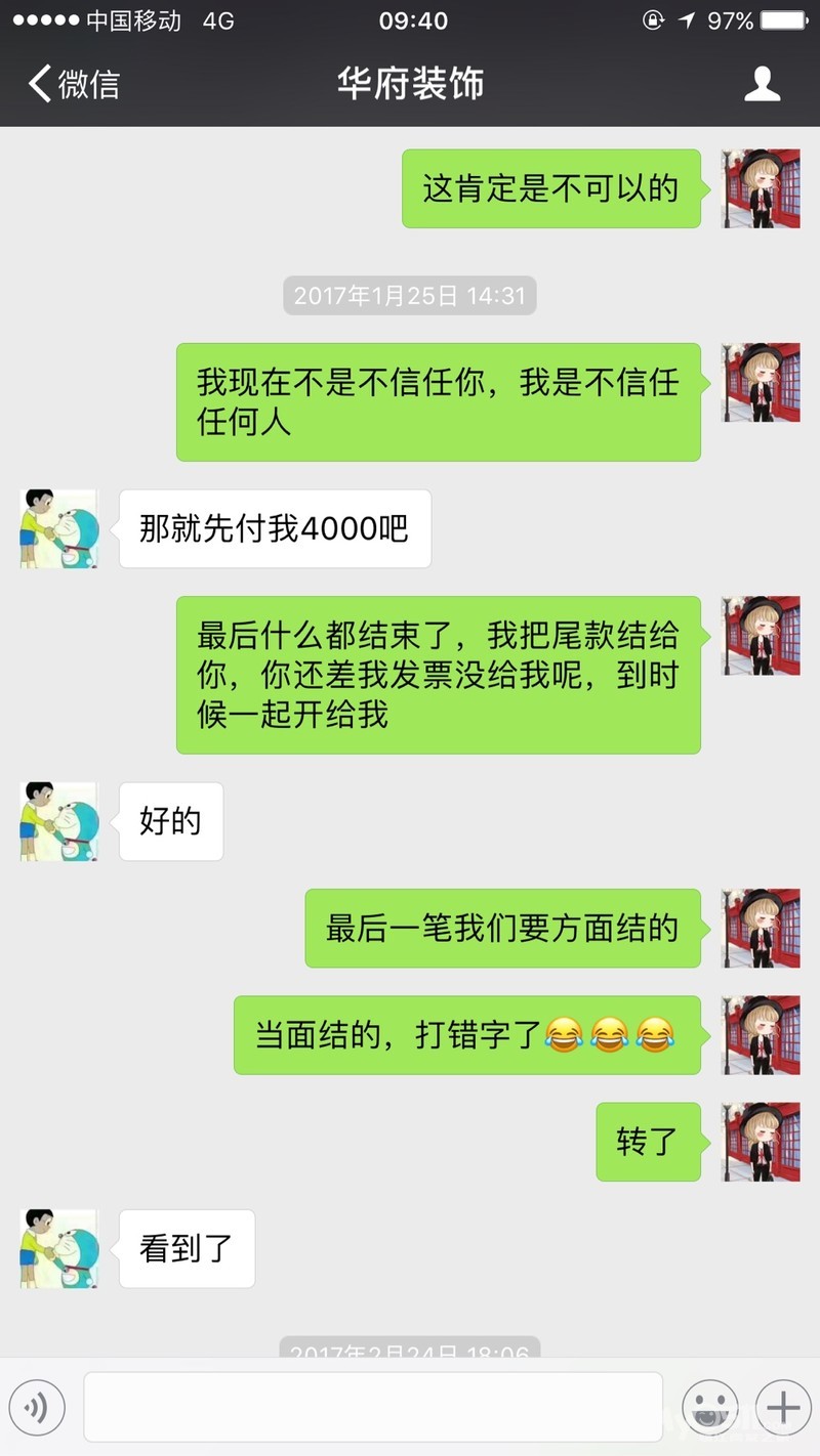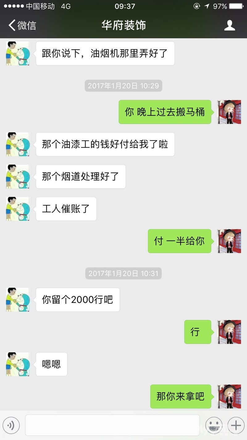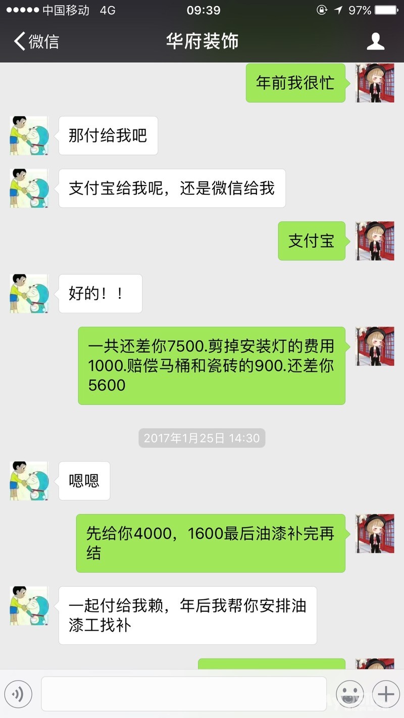 大家仔细看看聊天记录,他们家从装修以来一直出问题,没有一步没有不出问题的,所以我家装从9月份装到现在都没有装好,一半的时间在返工,高鹏在聊天记录里承认了时间有点慢,你们急着入住的还敢找这样有“效率”的装修公司吗?水电漏布控的说业主随意增加双控,设计不给纸档设计图,不给客户签字确认,然后说业主更改设计,没有预算表说业主随意扣钱,这就是华府装饰,请要装修的朋友们擦亮眼睛,打了官司也许只有我一个人会赢,但会有更多不知道的人掉进他们的坑,装修本来就是件操心的事情,再遇上这样的不负责任的公司更是头疼,钱花了还受折磨,请大家擦亮眼睛,打官司是件耗时耗钱的事情,我急着入住所以选择耗钱选择别的装修团队来装修,但我也要曝光他们,希望准备装修的朋友们不要选择华府装饰,地址是工人体育馆对面万科写字楼A座703.